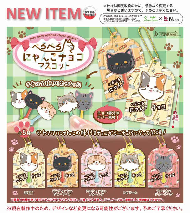 【ガチャ24年7月発売】ぺろぺろにゃんこチョコマスコット【Jドリーム】 【ガチャ24年12月発売】カヌレライト【キタンクラブ】 2024.10.082024.12.05 【ガチャ24年10月発売】食パンとジャムマスコット2【トイズスピリッツ】 2024.06.292024.08.14 【ガチャ25年9月再販】ジャストミートくん【エール】 2023.05.182025.05.27 食べ物系 2024.04.27 Jドリーム「ぺろぺろにゃんこチョコマスコット」 2024年7月発売商品のご紹介05🐈⬛「ぺろぺろにゃんこチョコマスコット」が登場 🐈🍫わんこに続いて🐶にゃんこのぺろチョコがマスコットになりました🐱💗ラインナップには苺チョコがベースのにゃんこも💕🍓チョコ部分はラバー素材で、中身を取り出してもかわいい💖#ガチャガチャ #カプセルトイ pic.twitter.com/KsTHLwvDE0— Jドリーム -カプセルトイ- (@Jdream_k) March 26, 2024 「ぺろぺろにゃんこチョコマスコット」が全国のカプセルトイ売り場から発売されます。 かわいいにゃんこの棒付きチョコがミニチュアになって登場! 商品名 ぺろぺろにゃんこチョコマスコット メーカーJドリーム 発売時期 2024年7月価格¥400内容(全5種)三毛猫ブリティッシュショートヘアスコティッシュフォールドラグドールアメリカンショートヘアJANコード4571596295973 楽天市場で探す Yahoo!ショッピングで探す Amazonで探す