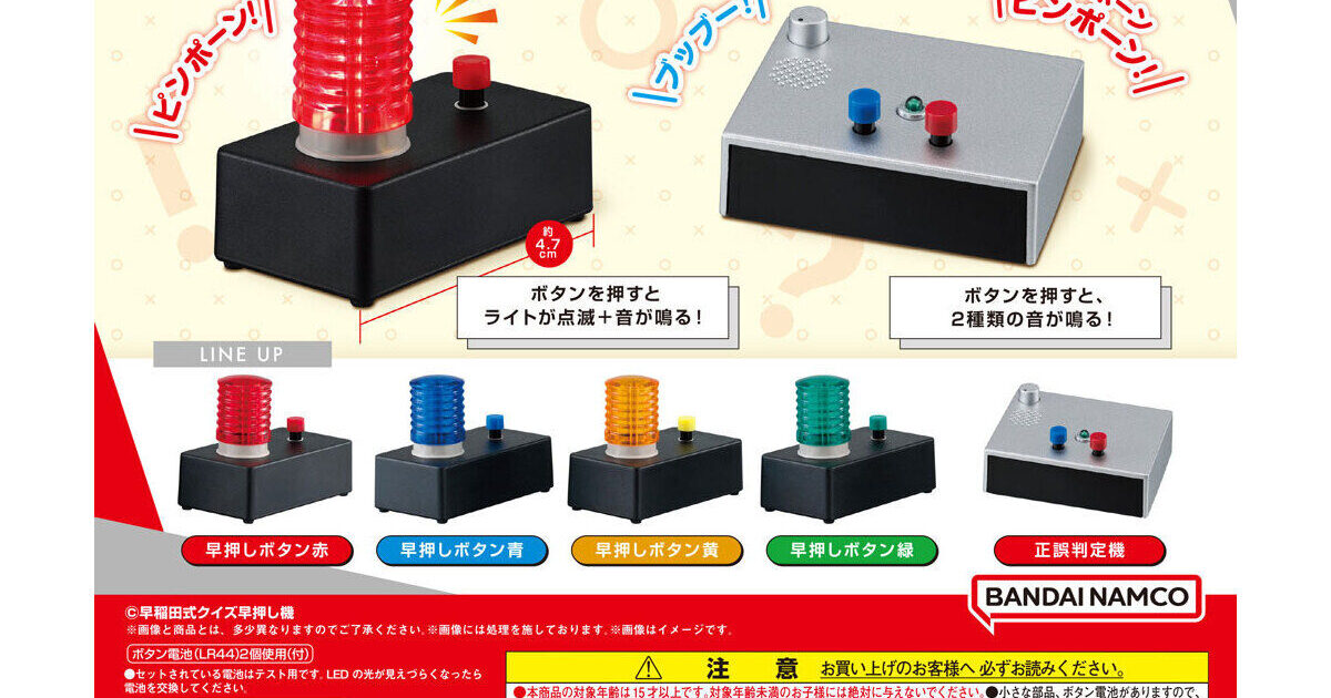 | 内容 (全5種) | 早押しボタン赤 早押しボタン青 早押しボタン緑 早押しボタン黄 正誤判定機 |