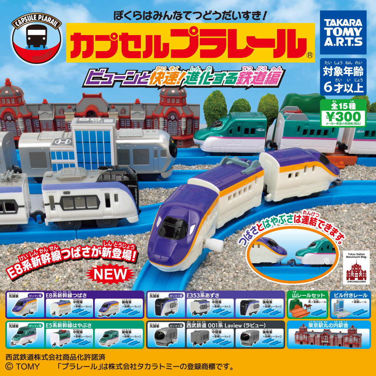 | 内容 (全7種) | E8系新幹線つばさ E5系新幹線はやぶさ E353系あずさ 西武鉄道001系Laview 山レールセット ビル付きレール 東京駅丸の内駅舎 |