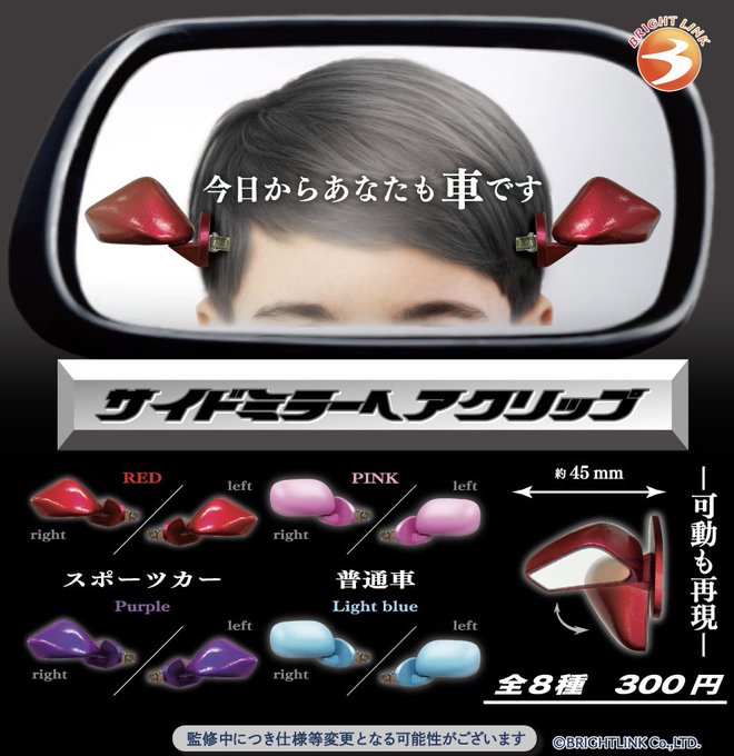 【ガチャ25年5月発売】サイドミラー ヘアクリップ【ブライトリンク】 【ガチャ24年10月発売】カプセルプラレール すてきなホリデー行楽列車編【タカラトミーアーツ】 2024.07.022024.08.15 【ガチャ26年2月発売】艦上戦闘機 垂直尾翼コレクション アクリルキーホルダー part1 F-14【エイチエムエー】 2025.10.262025.11.18 【ガチャ25年9月発売】オートバックスAUTOBACS ミニチュアアソート【バンダイ】 2025.09.042025.09.26 乗り物・ミリタリー 2025.02.14 ブライトリンク「サイドミラー ヘアクリップ」 x.com 「サイドミラー ヘアクリップ」が全国のカプセルトイ売り場から発売されます。 今日からあなたも車です 商品名 サイドミラー ヘアクリップ メーカーブライトリンク 発売時期 2025年5月価格¥300内容(全8種)レッド右レッド左パープル右パープル左ピンク右ピンク左ライトブルー右ライトブルー左JANコード4573558504482 楽天市場で探す Yahoo!ショッピングで探す Amazonで探す