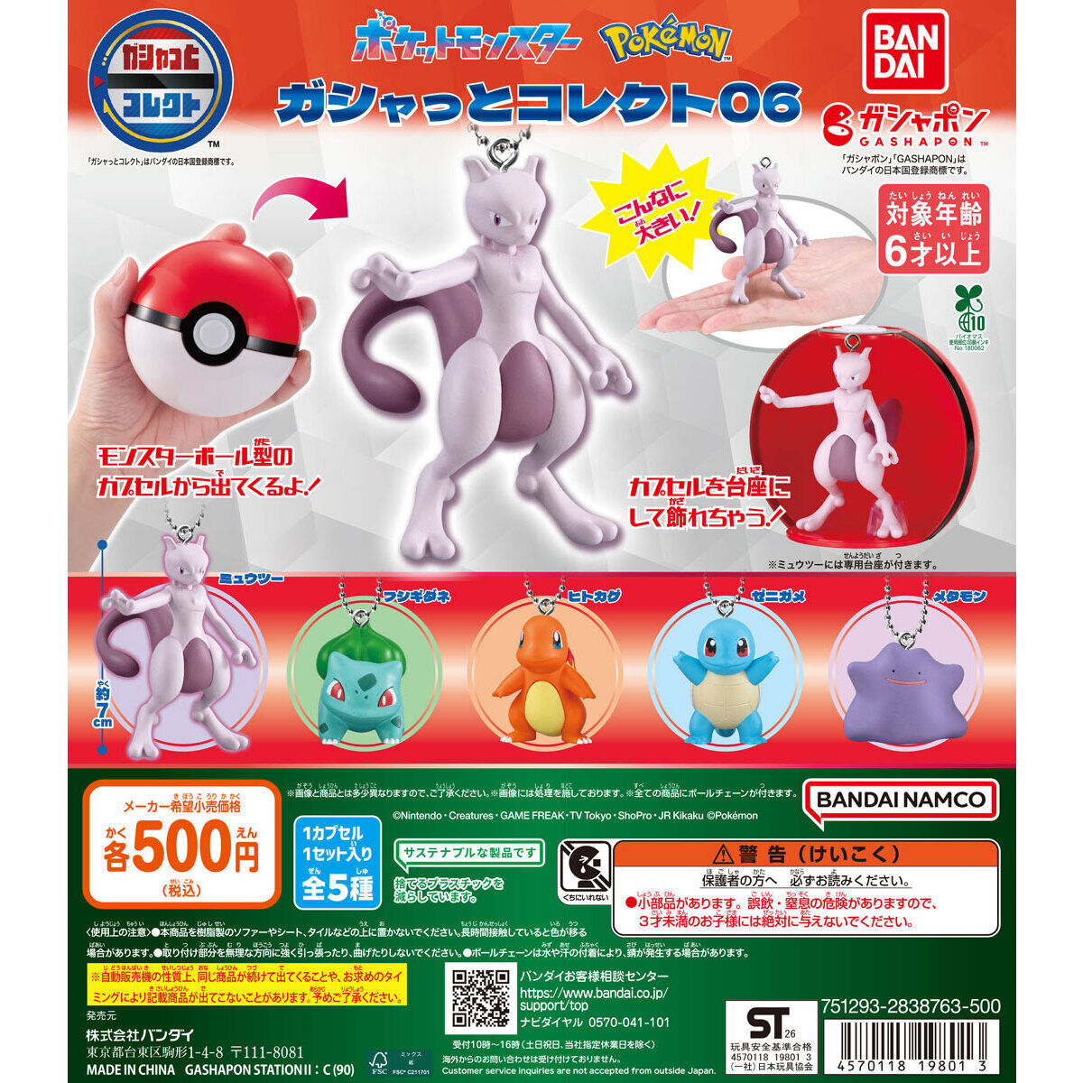 90mmのビッグサイズカプセル「ガシャっとコレクト」の第6弾が登場!約7cmのビッグサイズのミュウツーに、約4cmサイズのフシギダネ、ヒトカゲ、ゼニガメ、メタモンの全5種類。ボールチェーン付なので、スイングとしてもモンスターボール型カプセル...
